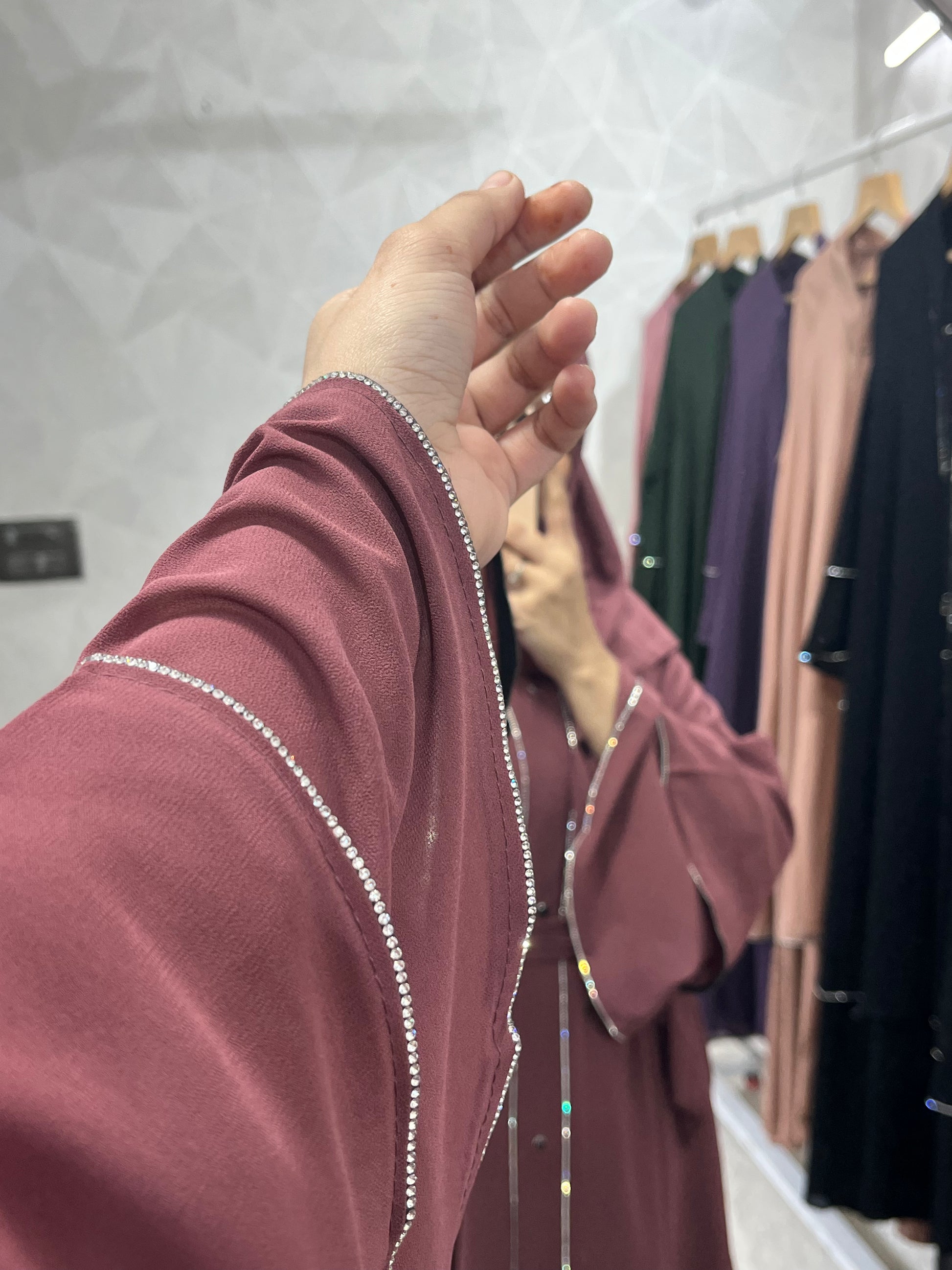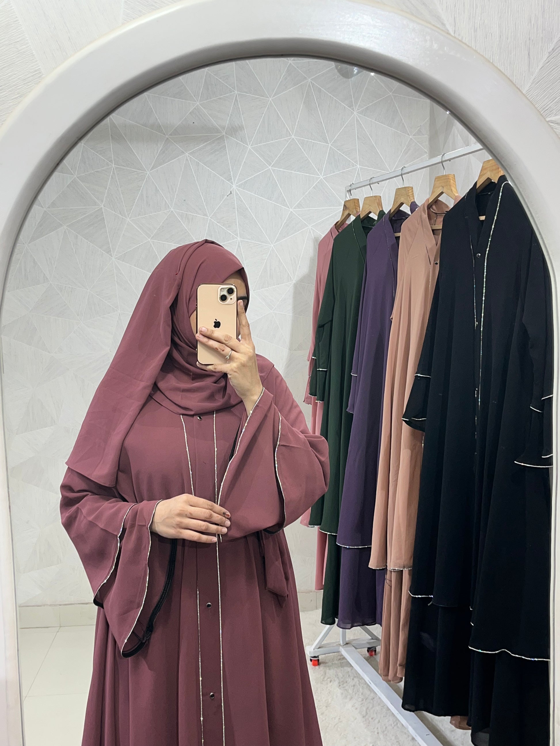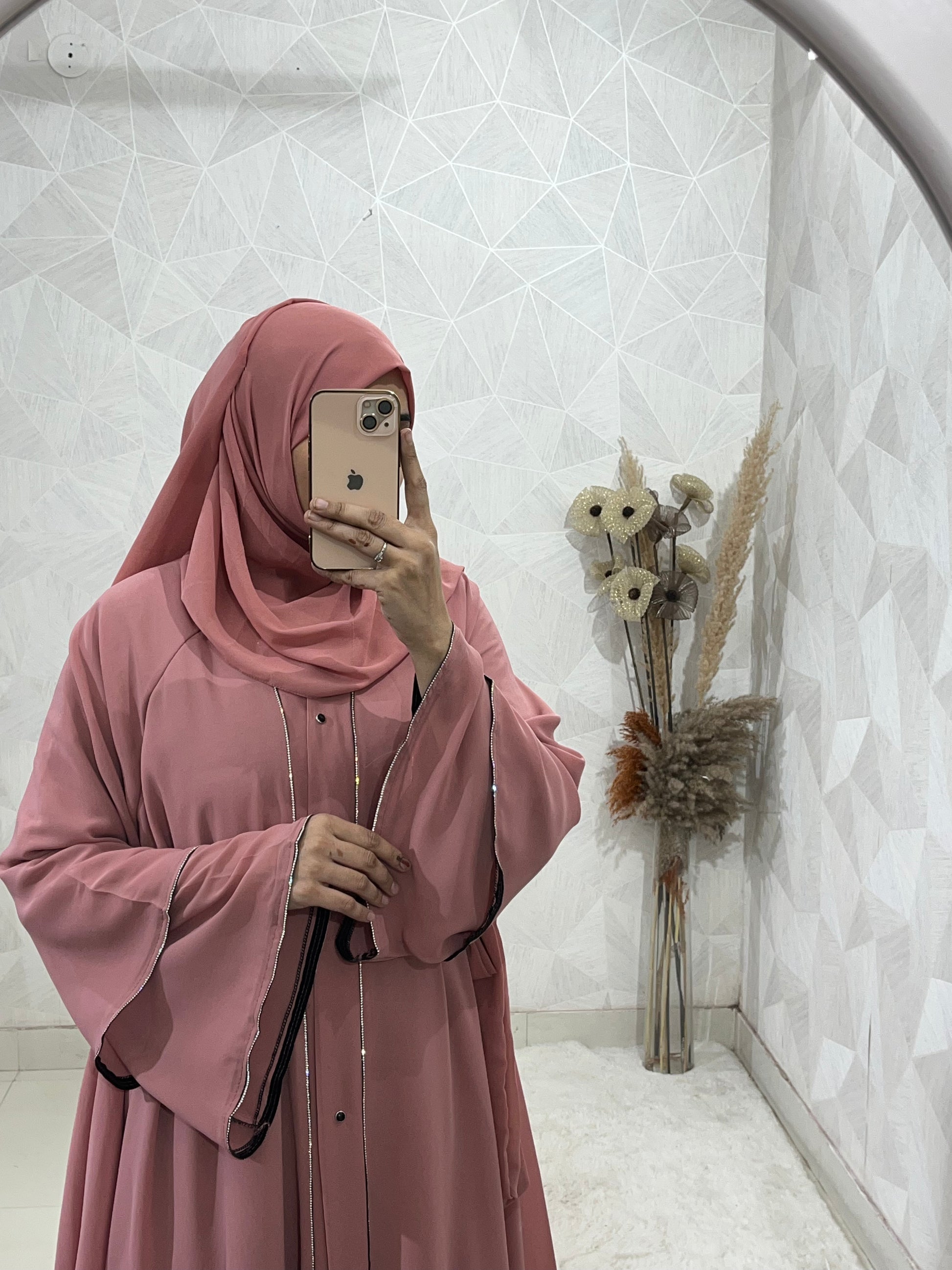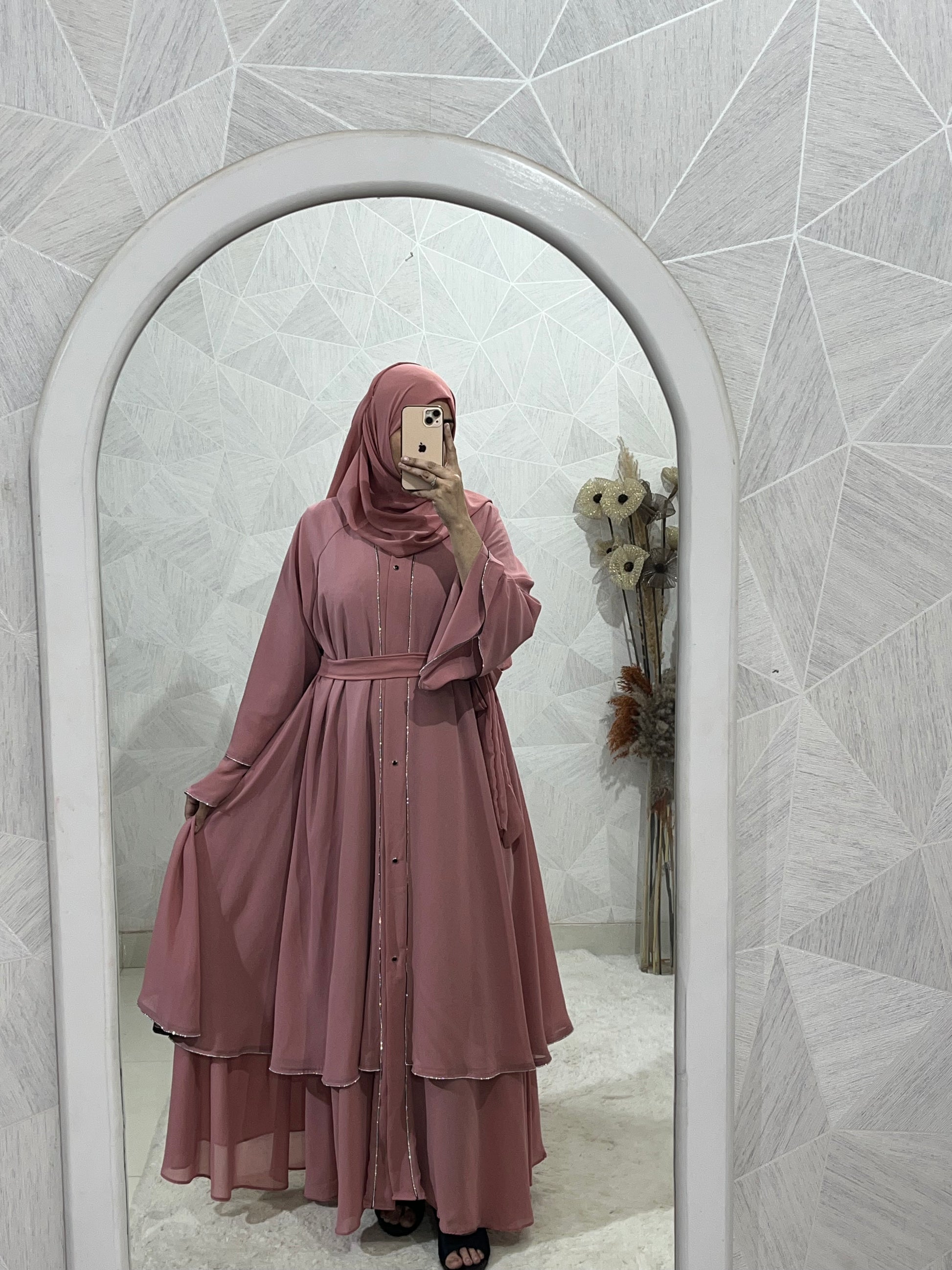 This stunning front open abaya features a large flared double layer with elegant stone work lace, adding a touch of sophistication. The double-layer stone lace sleeves enhance its graceful appeal.